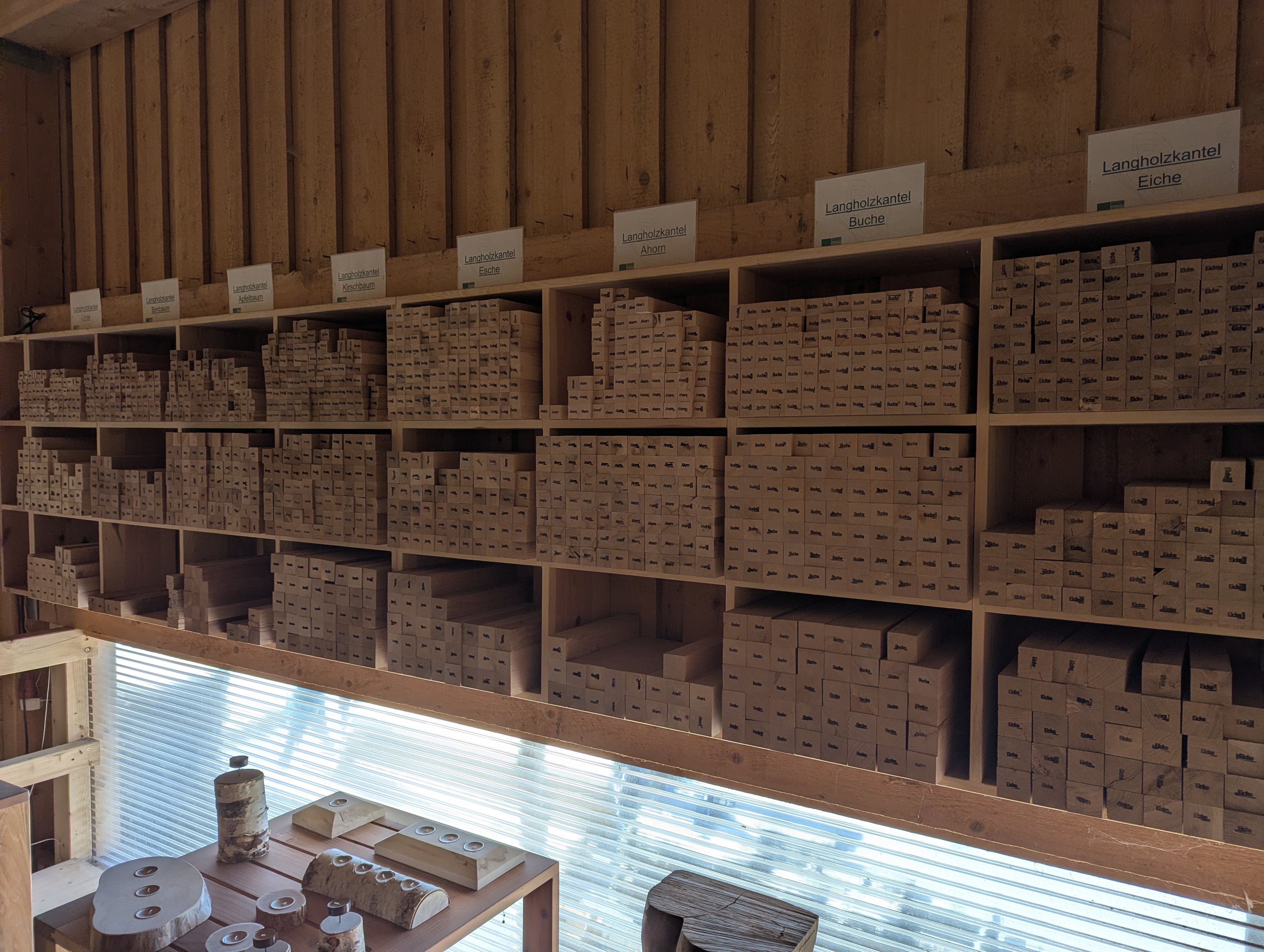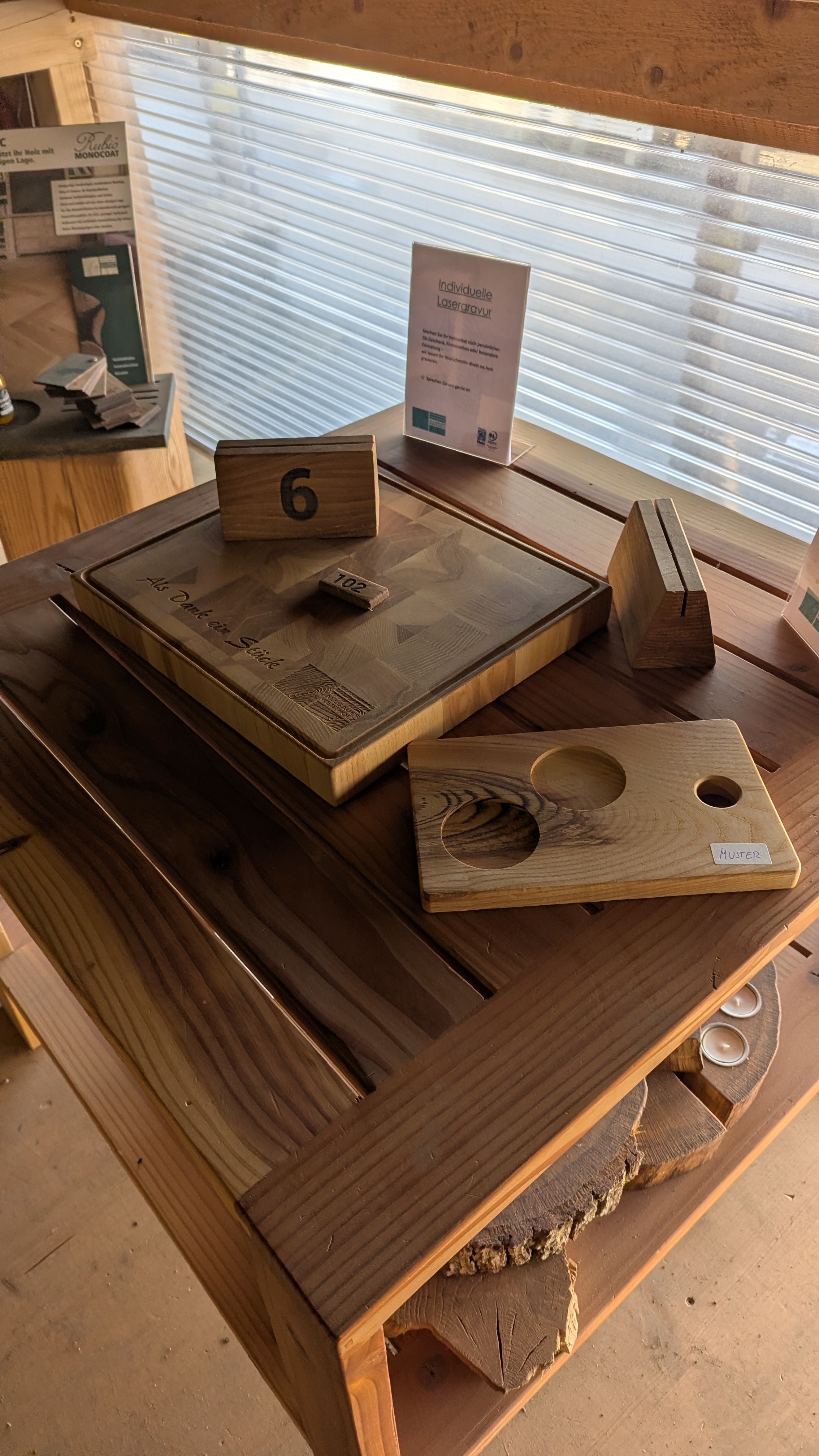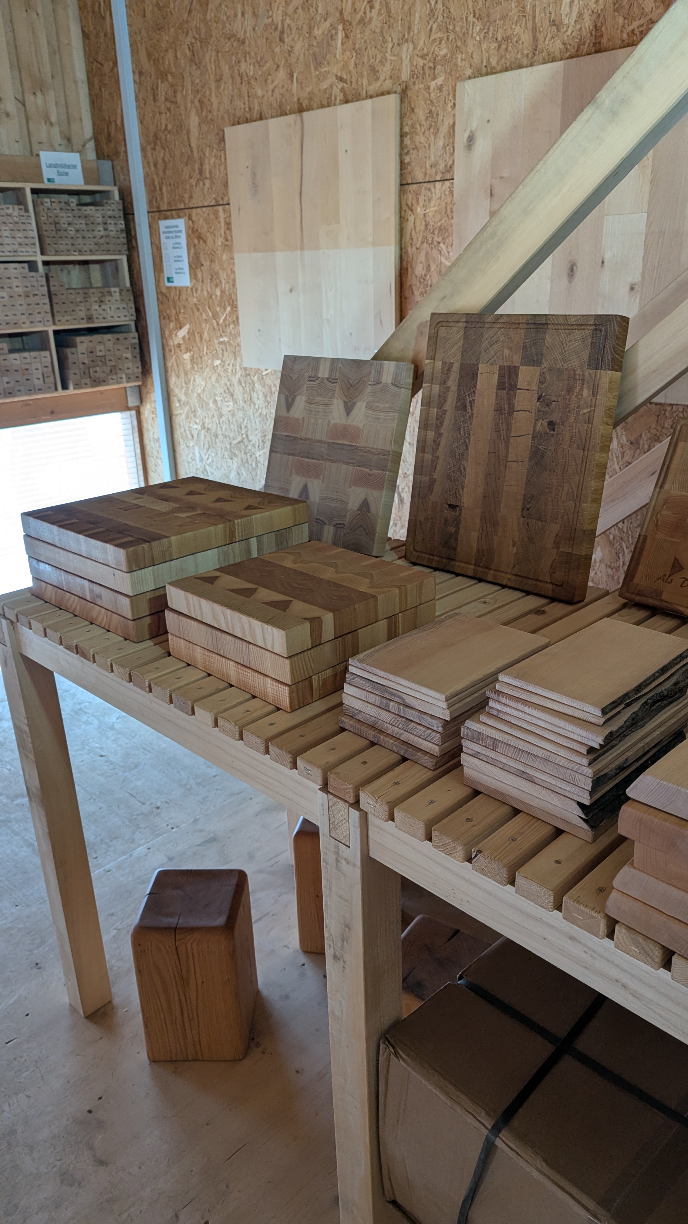 Und wer lieber etwas Fertiges mitnimmt, findet bei uns auch weiterhin ausgewählte Schneidebretter und Dekoartikel aus regionalem Holz.